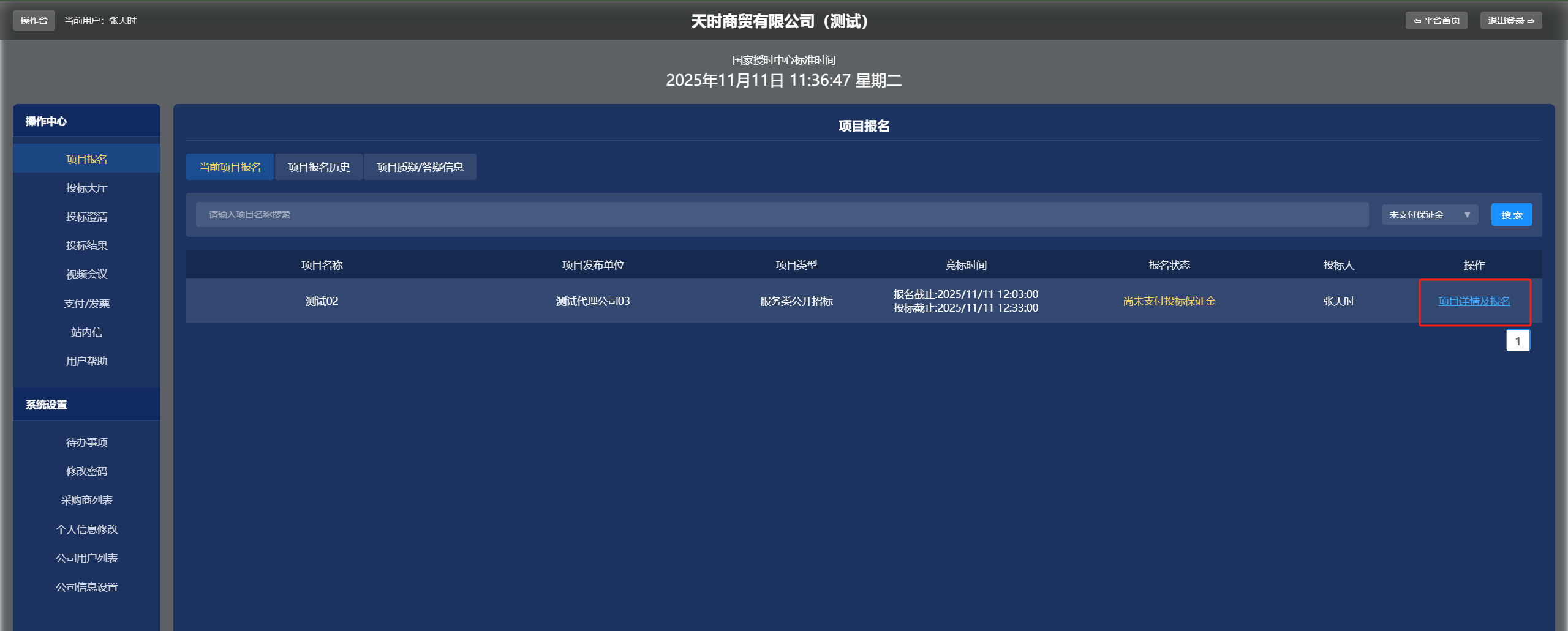 (一)报名审核完成后(邀请项目无须审核)后,需要支付保证金的项目可以在登录后的“待办事项”中看到<支付保证金>,然后点击操作栏中的<项目详情及报名>