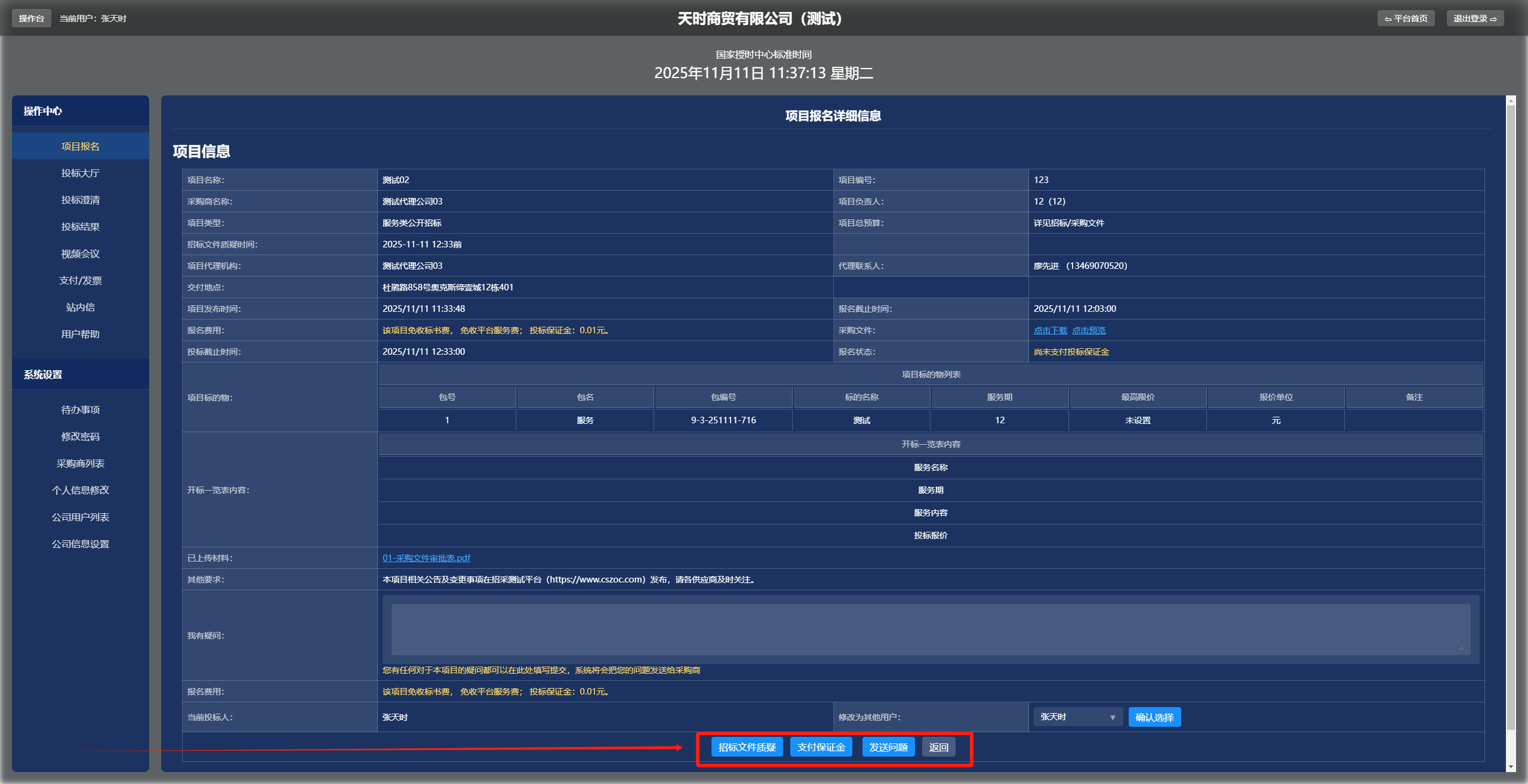 (二)在项目详情页中查看项目的详细信息,如有疑问可以在“我有疑问”栏中输入问题,然后点击<发送问题>;如果没有疑问则点击底部<支付保证金>,跳转到支付页面